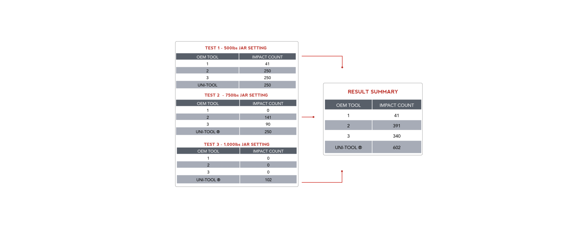 Three jar settings were selected for the experiment: 500 lbs, 750 lbs, and 1,000 lbs. The goal was to achieve 250 impacts at each setting before progressing to the next higher setting. The results were impressive, showcasing the high performance and durability of the Uni-Tool® in demanding well intervention scenarios.